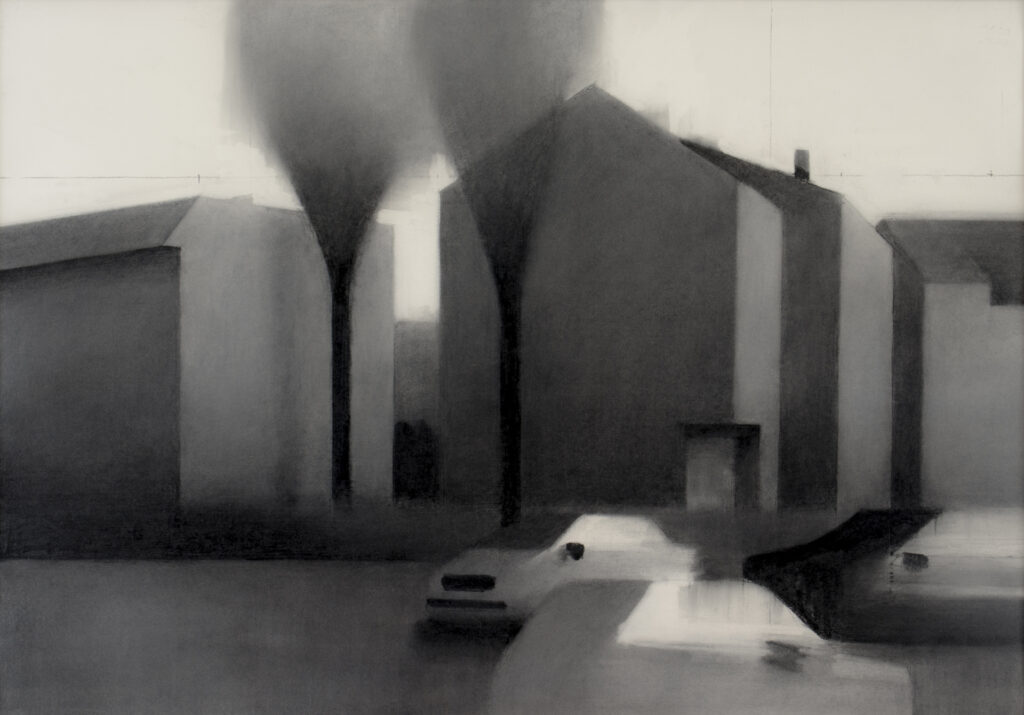 Cars and buildings in Vrbani area, 2022, charcoal on paper, 70×100 cm